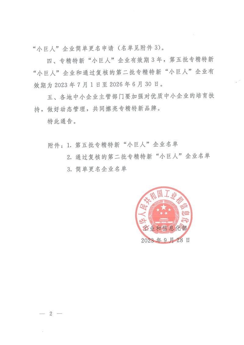 為貫徹習(xí)近平總書記關(guān)于“激發(fā)涌現(xiàn)更多專精特新中小企業(yè)”的重要指示精神,落實(shí)黨的二十大決策部署,工業(yè)和信息化部啟動(dòng)了第五批專精特新“小巨人”企業(yè)審核的工作,我公司榮獲第五批專精特新“小巨人”稱號(hào)。